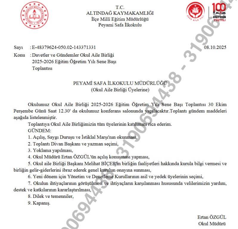 Okulumuz Okul Aile Birliği 2025-2026 Eğitim Öğretim Yılı Sene Başı Toplantısı 30 Ekim Perşembe Günü Saat 12.30' da okulumuz konferans salonunda yapılacaktır.Toplantı gündem maddeleri aşağıda listelenmiştir. Toplantıya Okul Aile Birliğimizin tüm üyelerinin katılımını rica ederim. GÜNDEM: 1. Açılış, Saygı Duruşu ve İstiklal Marşı'nın okunması, 2. Toplantı Divan Başkanı ve yazman seçimi, 3. Yoklama yapılması, 4. Okul Müdürü Ertan ÖZGÜL'ün açılış konuşması yapması, 5. Okul aile Birliği Başkanı Melihat BİÇER'in birliğin faaliyetleri hakkında kurula bilgi vermesi ve birliğin gelir-giderlerini ibraz ederek genel kurulun onayına sunması, 6. Yeni dönem için Yönetim ve Denetleme Kurullarının asil ve yedek üyelerinin seçimi, 7. Okulun ihtiyaçlarının görüşülmesi ve ihtiyaçların karşılanması hususunda velilerimizin yardım, destek ve katkılarının kararlaştırılması, 8. Dilek ve temenniler, 9. Kapanış